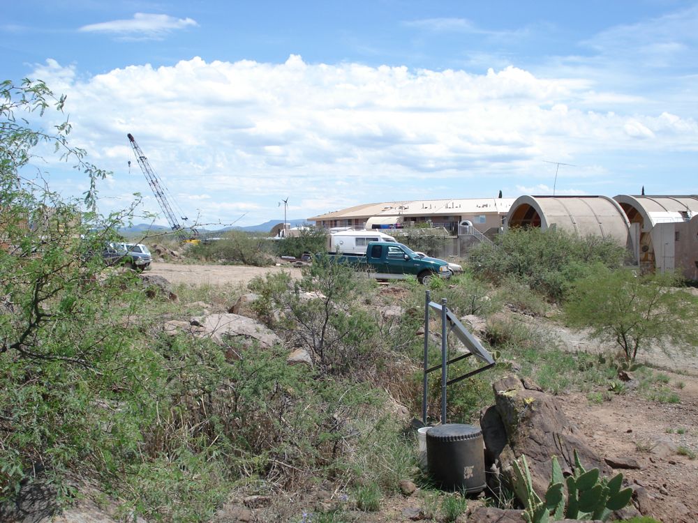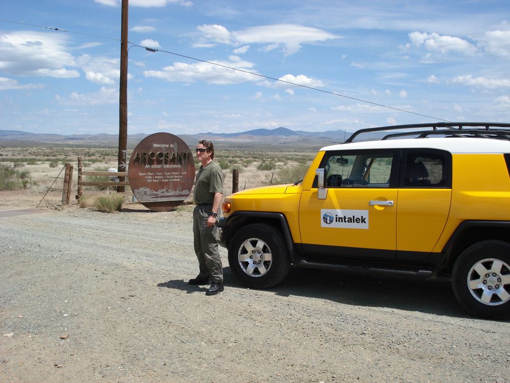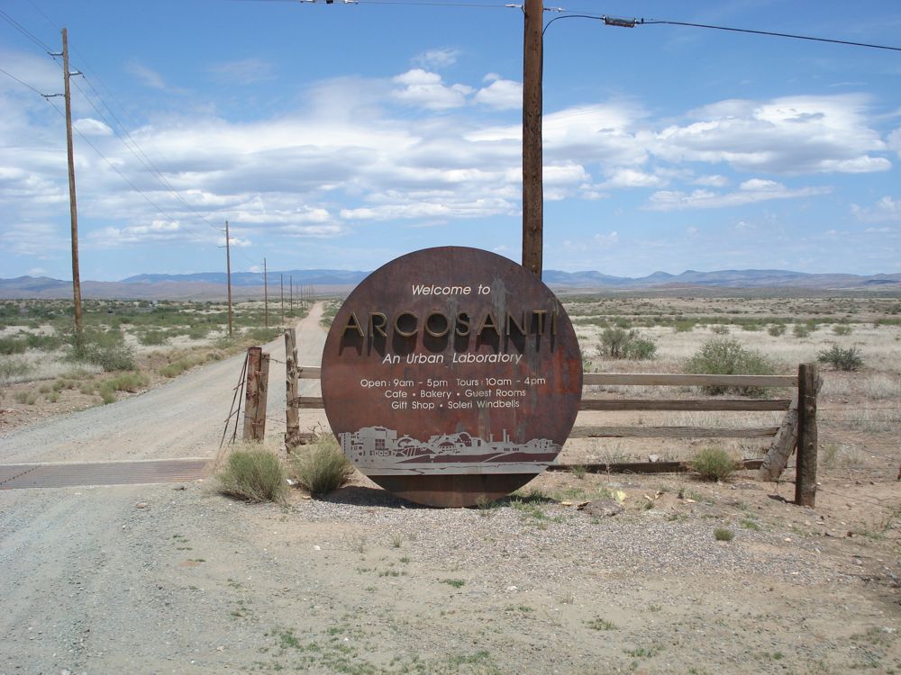 Arcosanti is a self-contained experimental town that began construction in 1970 in central Arizona, 70 miles (110 km) north of Phoenix, at (elev. 3732 feet/1130 meters). Paolo Soleri, using a concept he calls arcology (a portmanteau of architecture and ecology), designed the town to demonstrate ways urban conditions could be improved while minimizing the destructive impact on the earth.