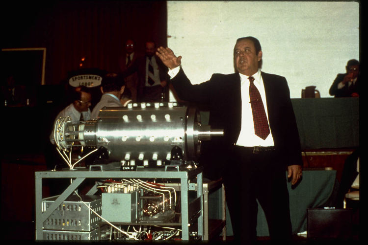 "... In 1958, Edwin V. Gray, Sr. discovered that the discharge of a high voltage capacitor could be shocked into releasing a huge, radiant, electrostatic burst. This energy spike was produced by his circuitry and captured in a special device Mr. Gray called his "conversion element switching tube." The non-shocking, cold form of energy that came out of this "conversion tube" powered all of his demonstrations, appliances, and motors, as well as recharged his batteries. Mr. Gray referred to this process as "splitting the positive." During the 1970's, based on this discovery, Mr. Gray developed an 80 hp electric automobile engine that kept its batteries charged continuously. Hundreds of people witnessed dozens of demonstrations that Mr. Gray gave in his laboratory. His story is well documented in the following materials. ...", see E. V Gray website.
