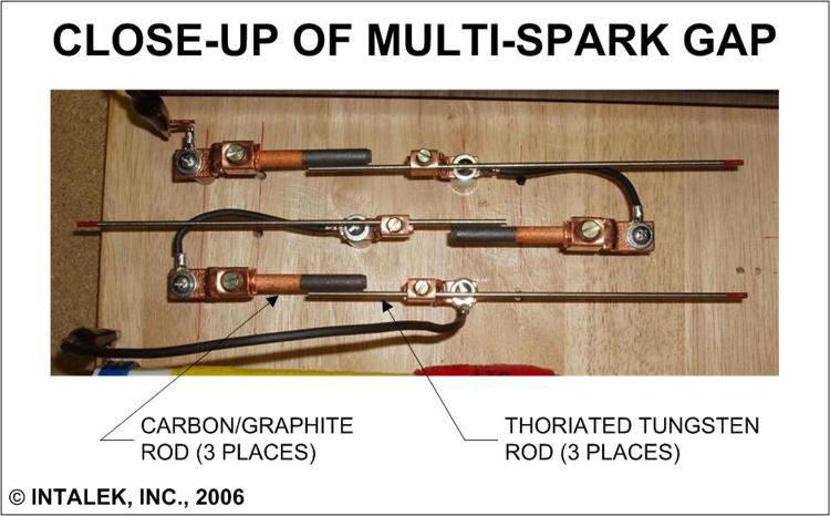 Figure 2. Close-up view of three Carbon/Graphite - Thoriated Tungsten spark gaps wired in series.
