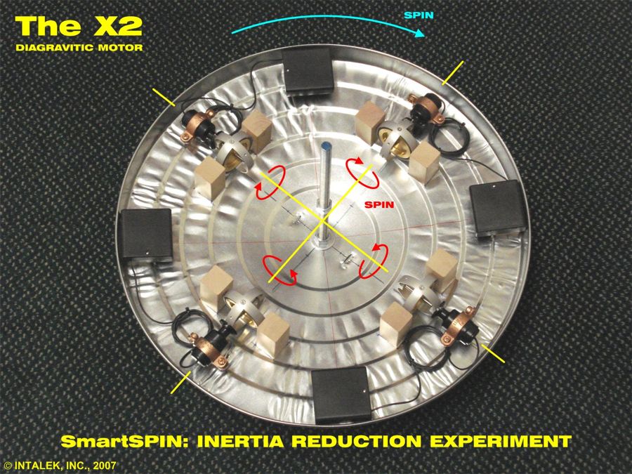 CONCLUSION: Close examination of the video above shows ONLY a loss of weight that occurred when the X2 was operated. At NO time during this operation did the scale indicate an increase in weight, a weight above its static weight of 18.5 lbs. I suspect this is a violation of Newton's Third Law of equal and opposite forces, and that an imbalance of forces exists. The forces are finally brought into balance through a torsion or moment effect, a torsion field effect, if you will. This torsion effect is directed antigravitationally, or acts against the force of gravity, resulting in a loss of weight. This loss, I believe, is due to the opposing spin of the gyroscopic rotors, a quantum entanglement of rotors, leading to a decrease in inertia of the spinning system. This effect is further "amplified" by rotating the entire assembly.