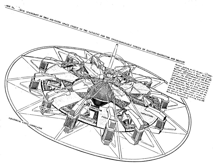 Fig 4. shows the internal detail of the Carr's X1 machine. Its interesting to note Carr's prototype craft was 6' in diameter and used an array of six gyroscopes, which he called a "Regenerating Accumulator", or the UTRON.