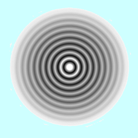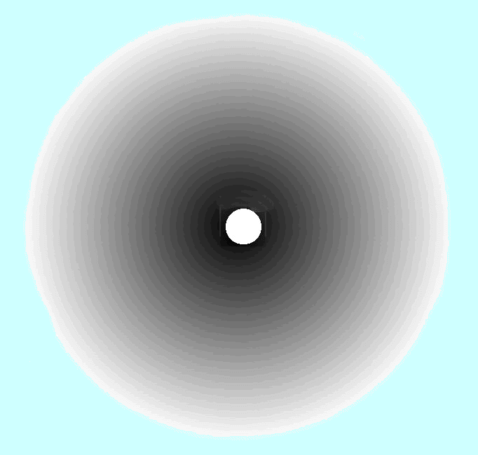 Figure 3 illustrates the cross section of an electron at rest, representing the electric field density by a dark area. The electric field of an electron at rest is isotropic (in 3-D) around its hollow core and extends to infinity.Figure 3.